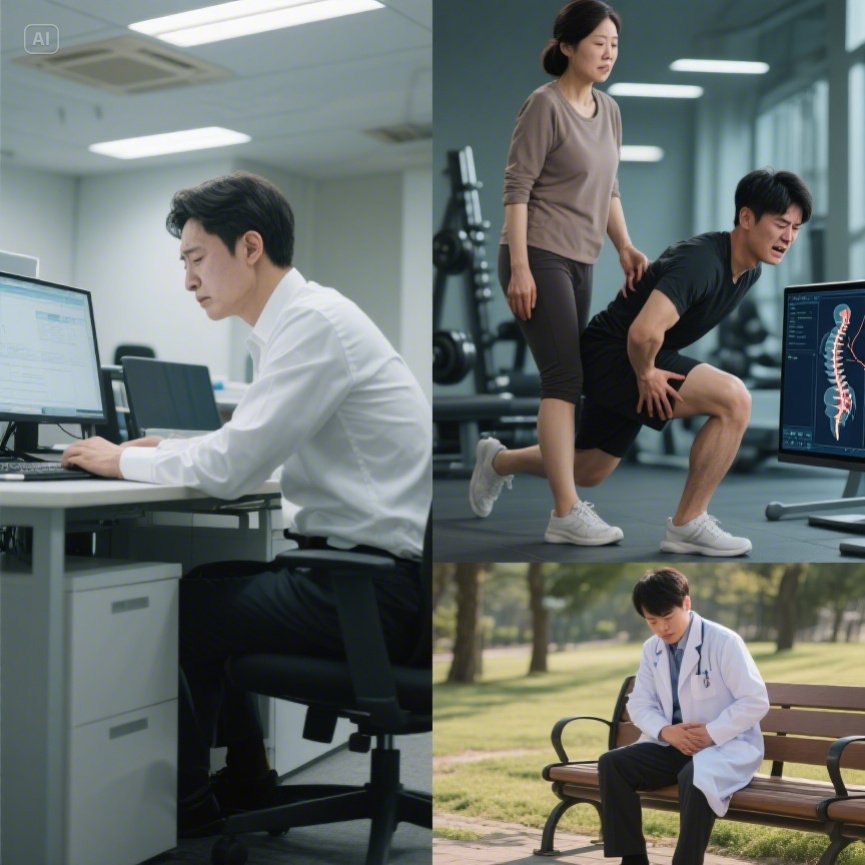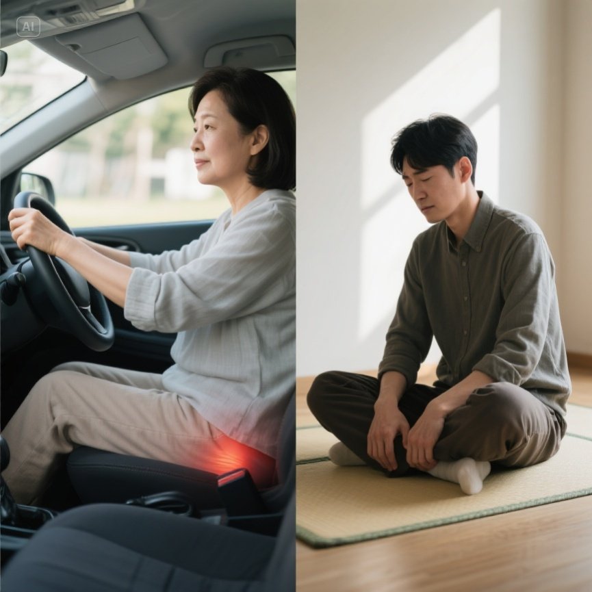 다리를 꼬고 앉거나, 한쪽으로만 체중을 실는 등의 비대칭 자세는 특정 부위 근육에 부담을 주어 통증을 유발합니다.