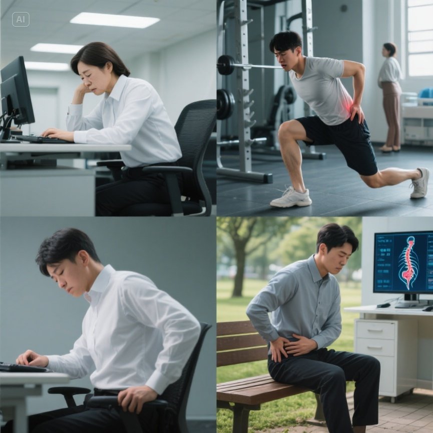 책상 앞에 오래 앉아 있다 보면 엉덩이 근육이 눌리면서 혈류가 감소하고, 결국 통증이 생기기 쉽습니다. 하루 종일 앉아 있는 직장인과 학생들에게 흔한 원인입니다.